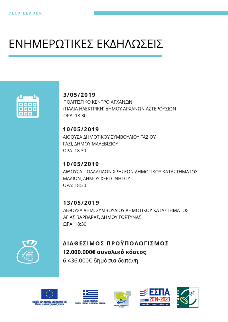 Στο πλαίσιο της πρόσκλησης θα πραγματοποιηθούν ενημερωτικές εκδηλώσεις με τους τοπικούς φορείς σε όλη την περιοχή παρέμβασης του προγράμματος, ως εξής: